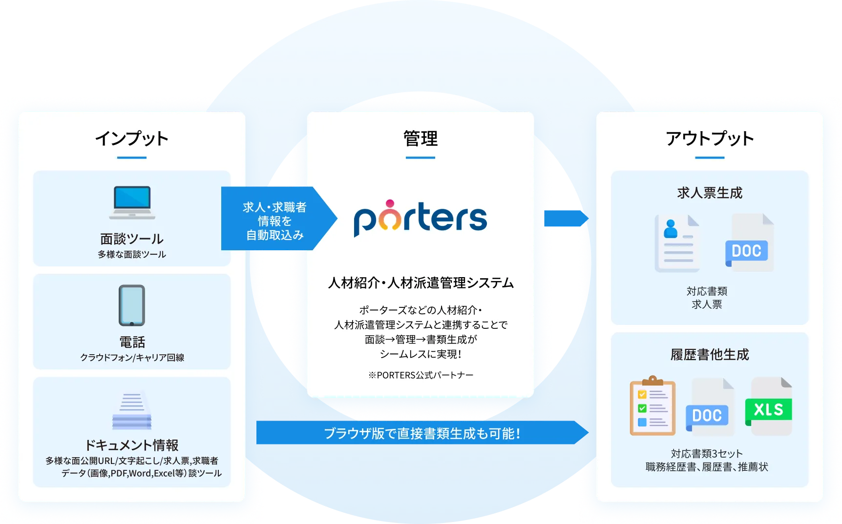 多様な面談ツールや求人・候補者情報から情報取込み→アウトプットまでポーターズと連携し